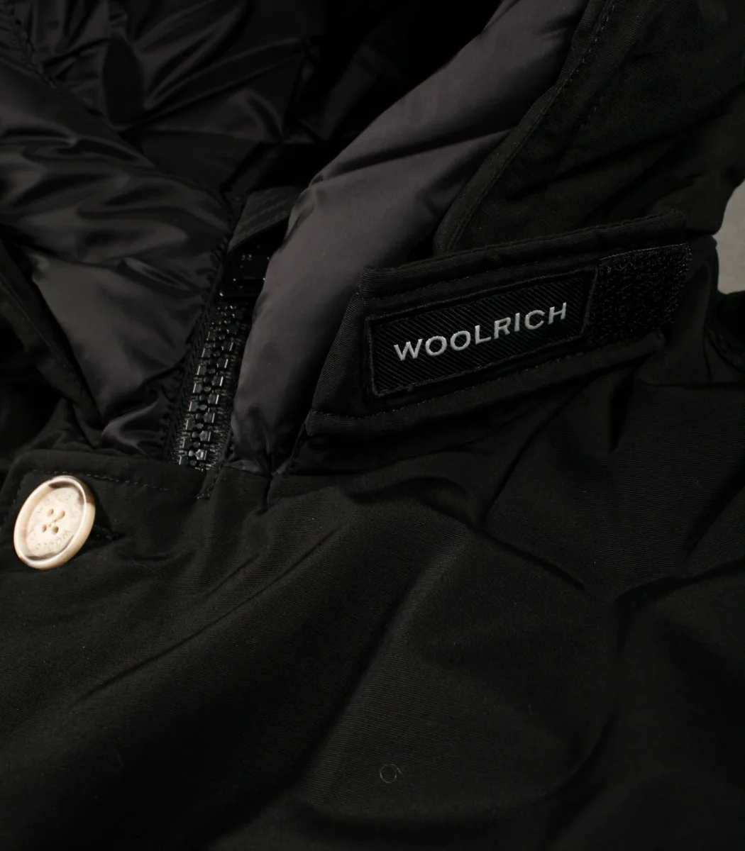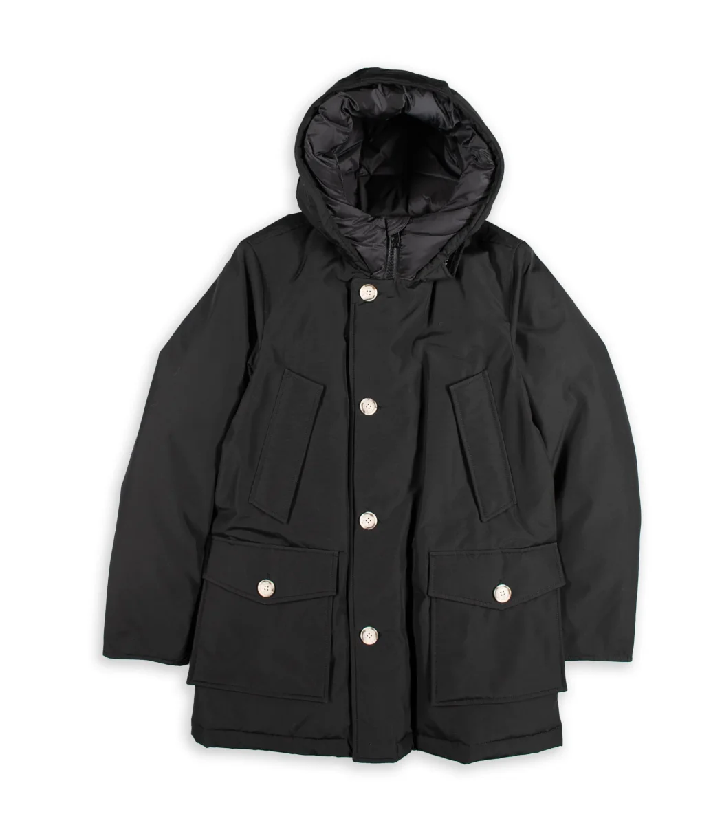 Artic parka Woolrich colore nero da uomo con cappucccio bottoni a vista tasche frontali imbottitura interna per un comfort garantito in qualsiasi condizione atmosferica.